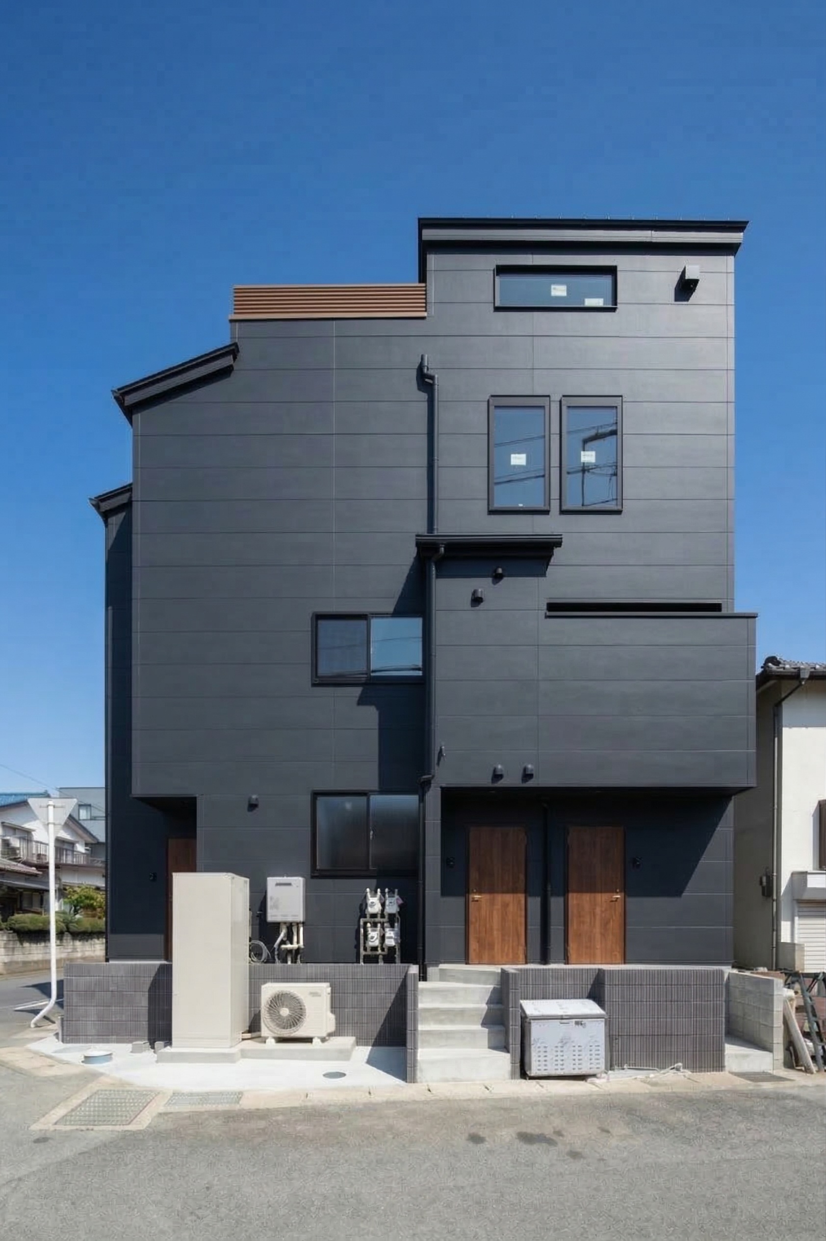 【千葉県船橋市】K様賃貸住宅新築工事の足場が解体!モダンな黒の外観がついにお披露目です