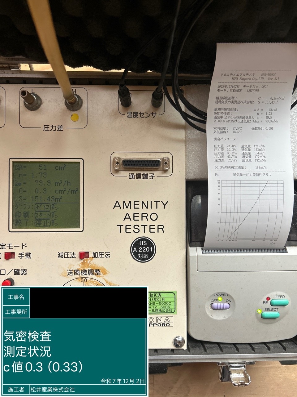 今回実施した気密測定の結果、建物の隙間相当面積を示すC値は「0.33 cm²/m²」という数値を記録しました。