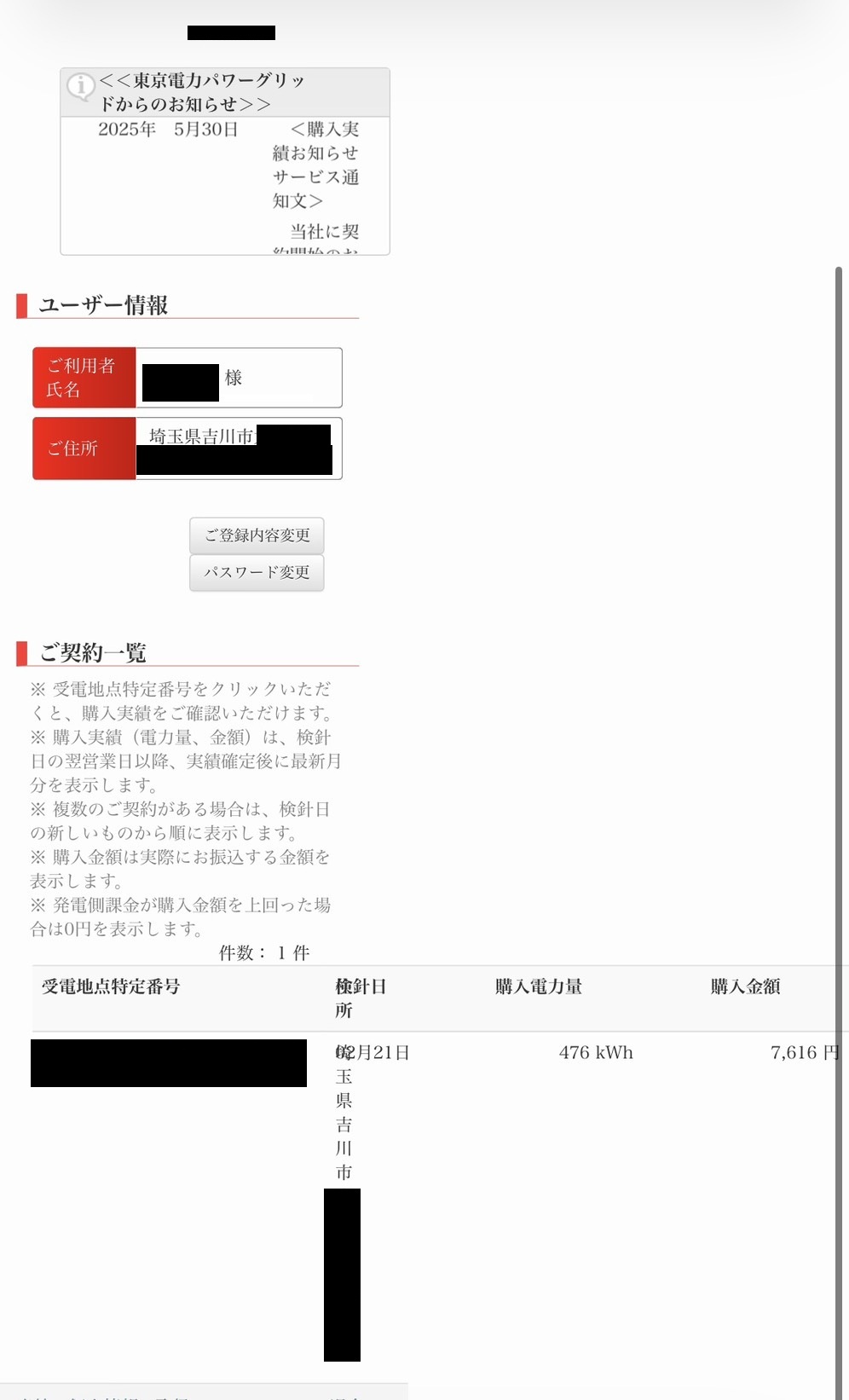 5月の売電実績(参考):7,616円(購入電力量 476kWh)