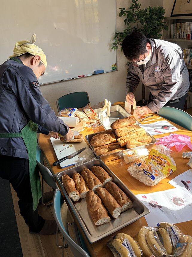 会議室が臨時のキッチンに早変わり。 バゲットをカットし、厚切りのハムとチーズを手際よく挟んでいくのは、普段は現場や営業でバリバリ働く社員たちです。タオルを頭に巻いて準備する姿は、まさに職人(!?)のようですね。