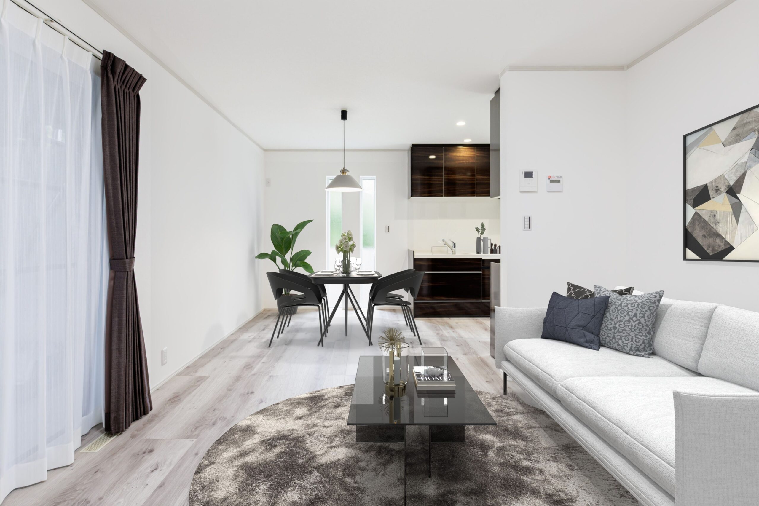 - シンプルな美しさ: 天井のシーリングライトやダイニングのペンダントライトも、空間の邪魔をしないシンプルでおしゃれなデザインをセレクトしました。