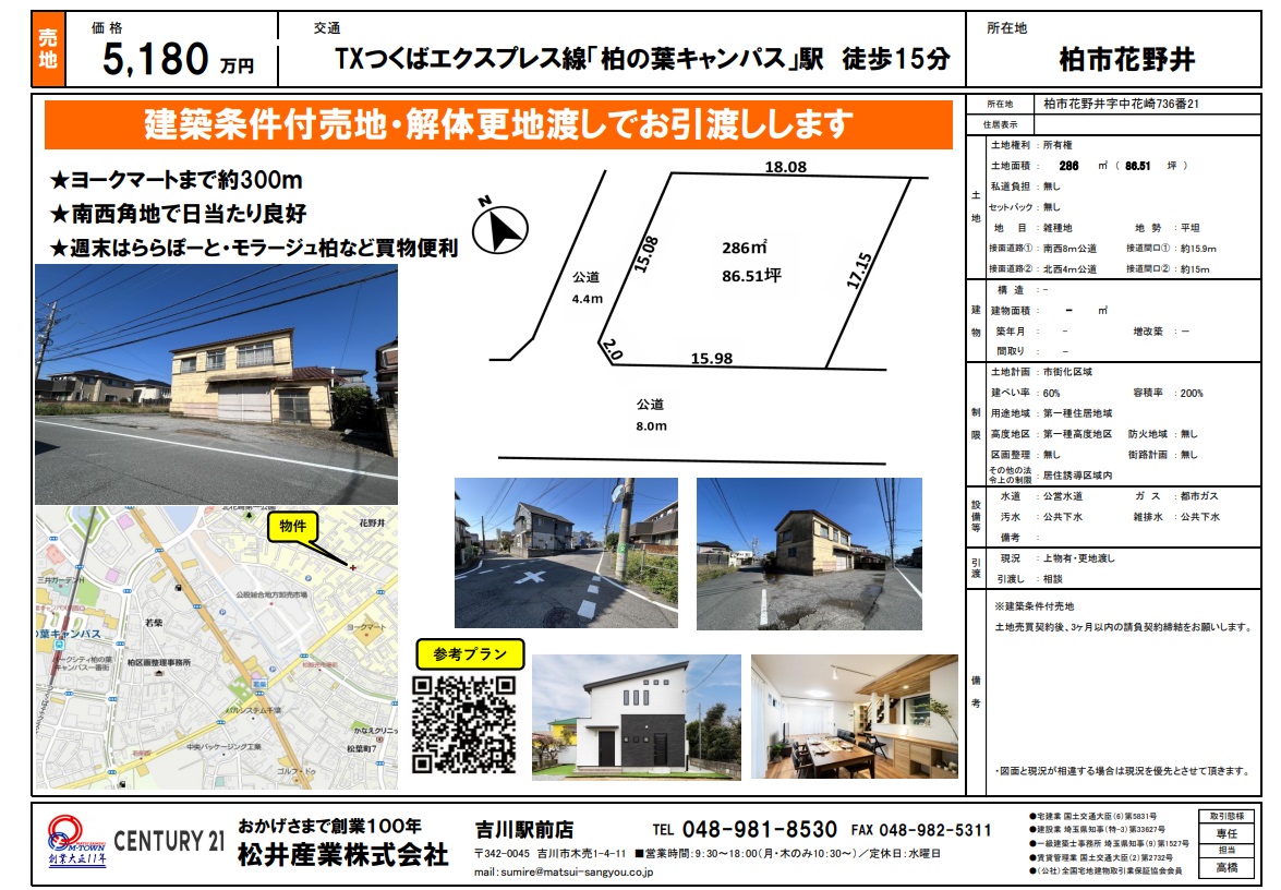 つくばエクスプレス 柏の葉キャンパス駅 徒歩15分 86.51坪 5180万円
